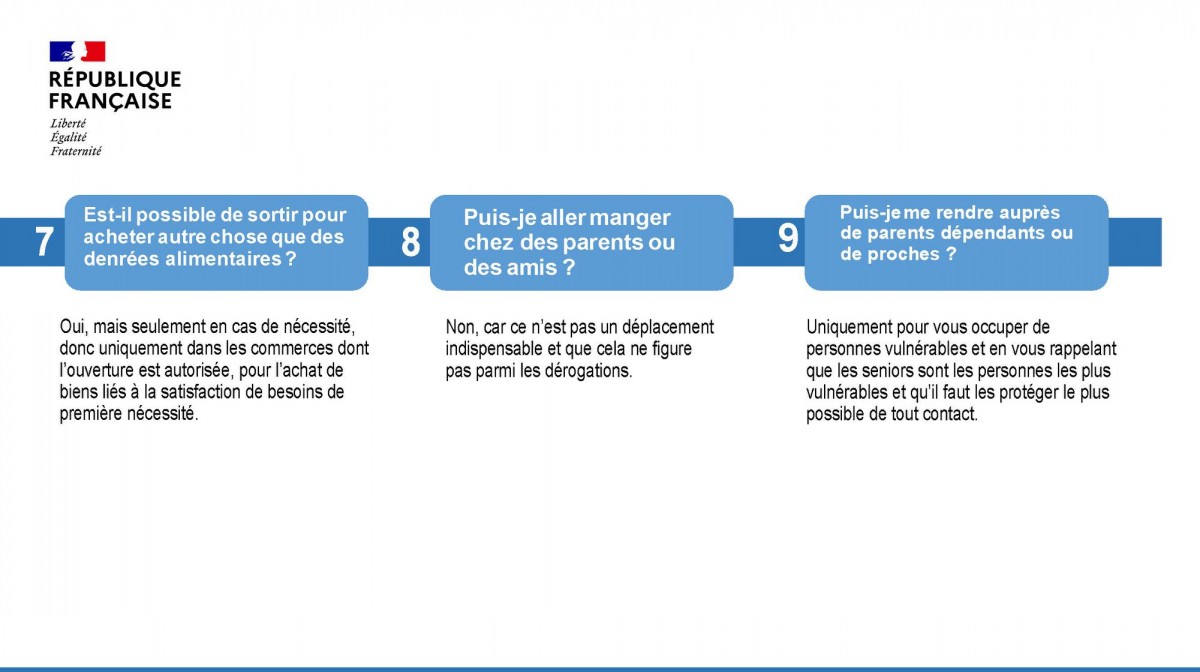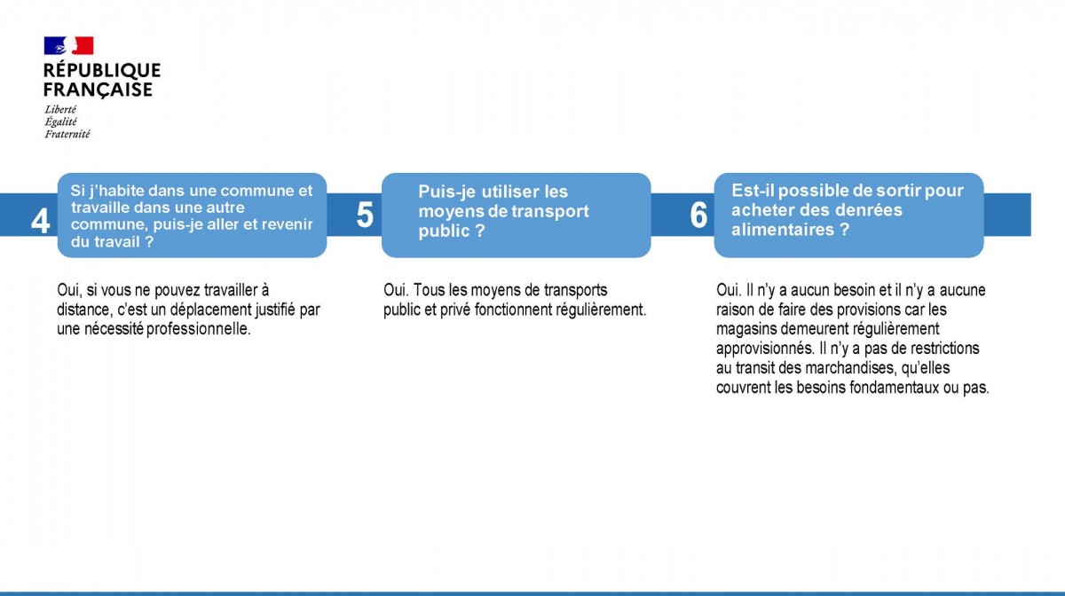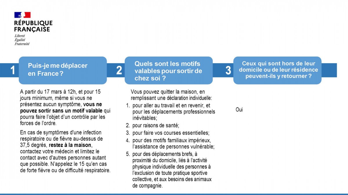 Le 16 mars 2020, le Président de la République a décidé de prendre des mesures pour réduire les contacts et déplacements au strict minimum sur l’ensemble du territoire à compter du mardi 17 mars à 12h00, pour quinze jours minimum.